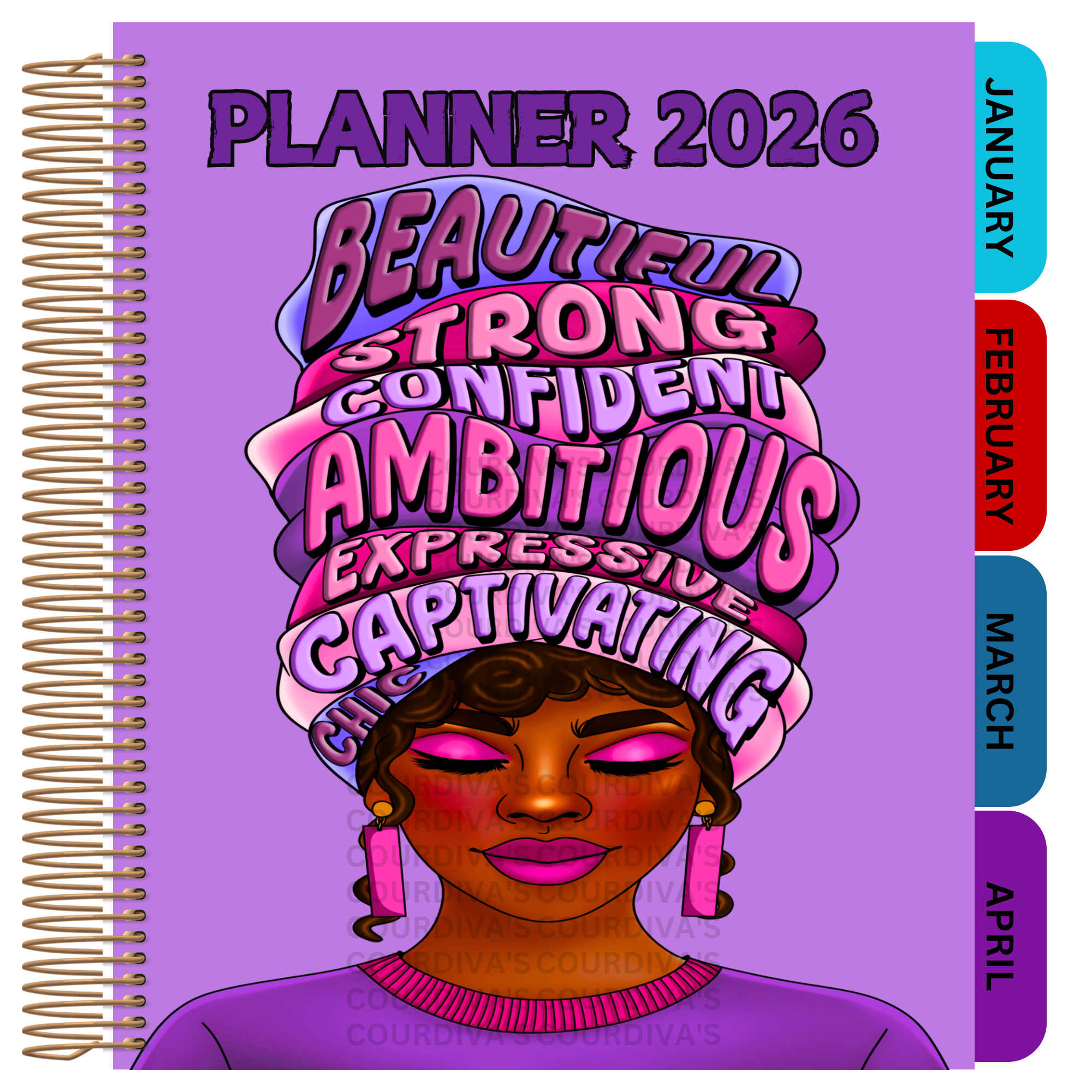 Brand new 2026 planners start in January 2026 and feature a year at a glance, 12 monthly and weekly spreads with colorful inspiring pages and beautifully empowering dividers.  Your planner will include a Vision Board, Goal, Water and Fitness Trackers, Coloring Pages and more.  Multiple cover options available.